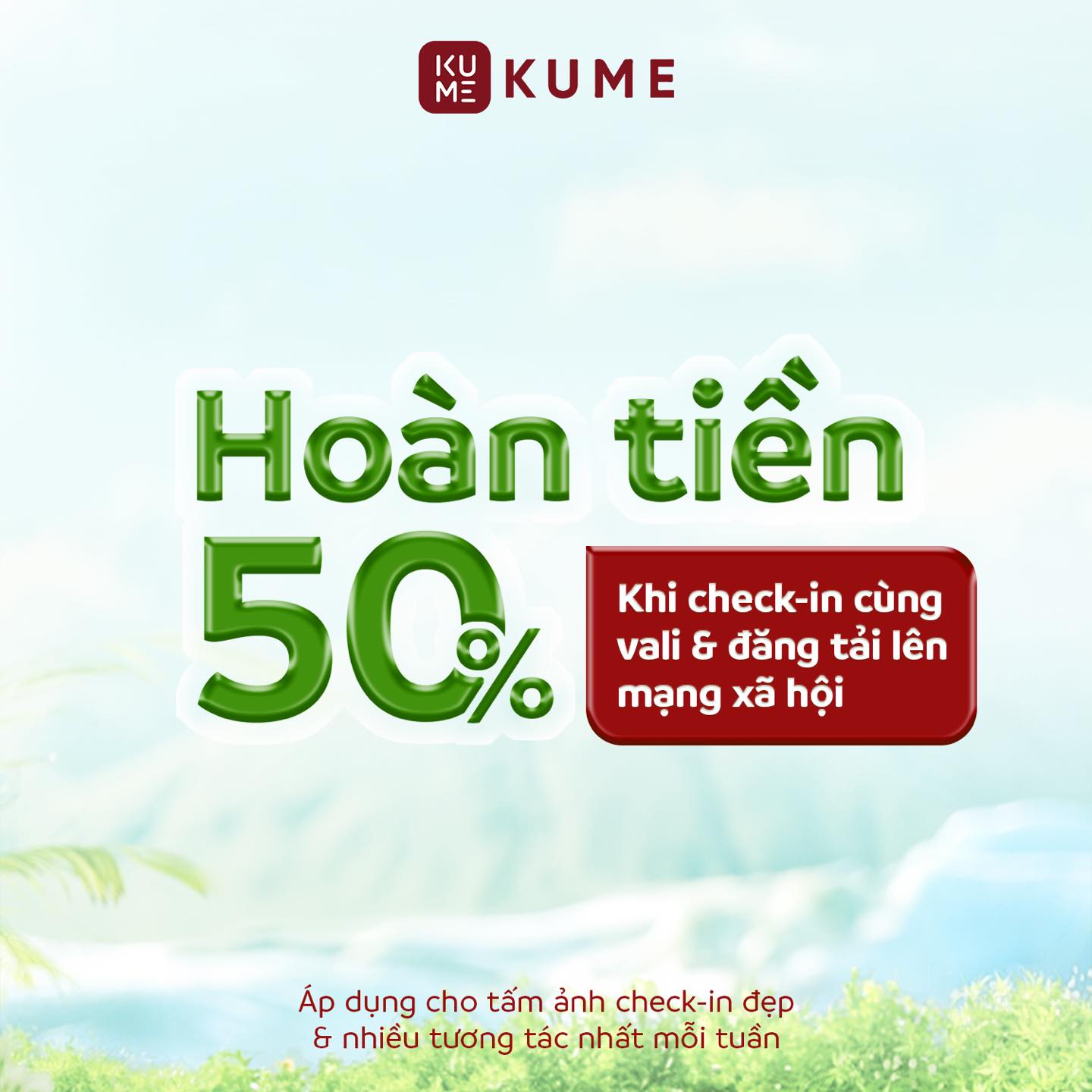 - Hoàn tiền 50% khi bạn check-in cùng vali và chia sẻ trên trang cá nhân. Áp dụng cho bài đăng có tương tác cao nhất mỗi tuần, khuyến khích bạn lan tỏa thông điệp bảo vệ môi trường đến với bạn bè và người thân.